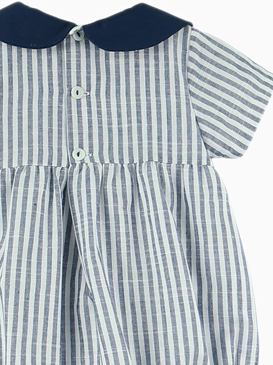 The romper is enhanced by a navy blue collar, which delicately contrasts with the stripes. This detail structures the outfit and frames the top with elegance.
