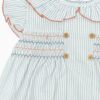 The smocked detail on the front of the dress adds texture and character. The embroidery blends touches of blue and orange, creating a delicate contrast against the fine stripes.