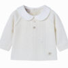 Il maglioncino in lana color crema si distingue per il suo elegante collo rotondo bianco, i suoi delicati dettagli lavorati sul davanti e i suoi due bottoni decorativi in madreperla, che aggiungono un tocco prezioso all’outfit del tuo bambino. La sua abbottonatura sul retro facilita la vestizione preservando il comfort e la libertà di movimento del tuo bambino, per giornate serene ed eleganti.