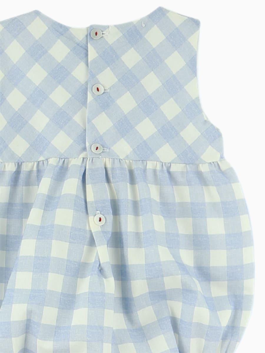 Notre barboteuse bébé à smocks et broderies de bateaux – bleu/blanc est une pièce pleine de douceur et de caractère, pensée pour habiller bébé avec élégance. Son tissu à carreaux bleu ciel et blancs apporte fraîcheur et luminosité, tout en conservant une allure intemporelle.