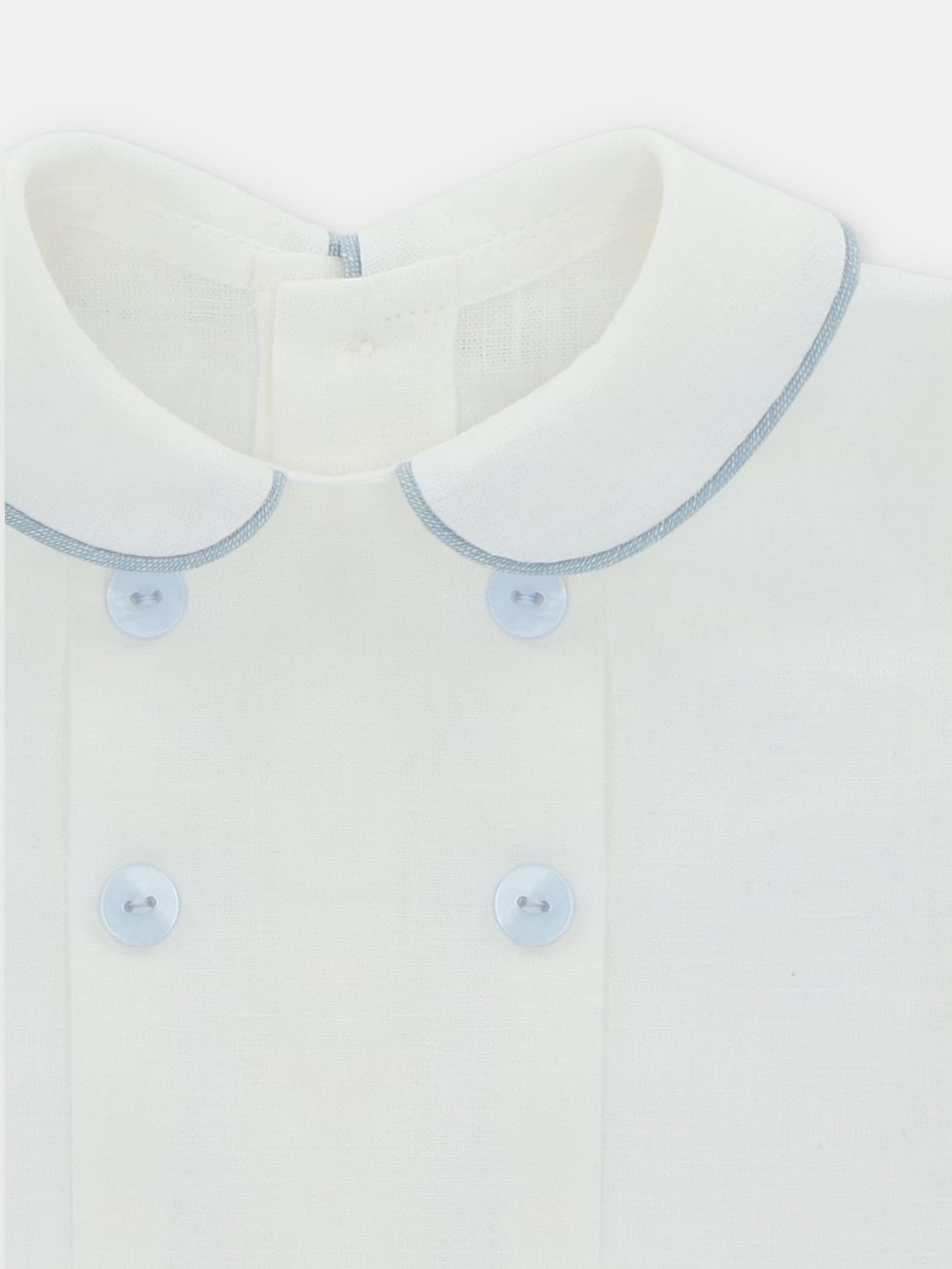 La blouse en coton se distingue par son col orné d’un liseré bleu ciel, repris également au bord des manches. Ces détails apportent une touche élégante et structurée, tout en restant discrets.