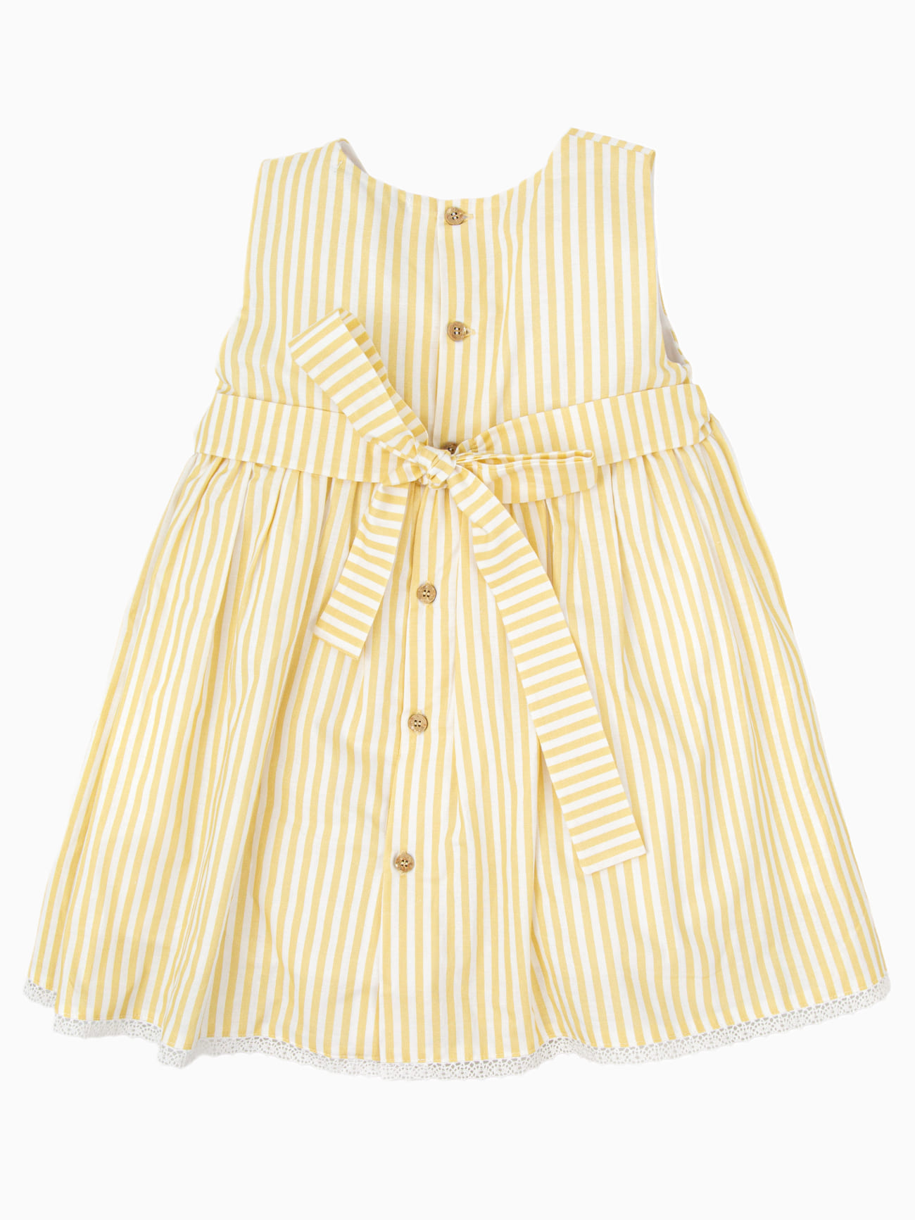Une bordure de dentelle souligne également le bas de la robe, créant un joli rappel et une finition soignée. Ces détails délicats renforcent le charme de notre robe rayée jaune moutarde et blanc et témoignent d’un travail attentif des finitions.