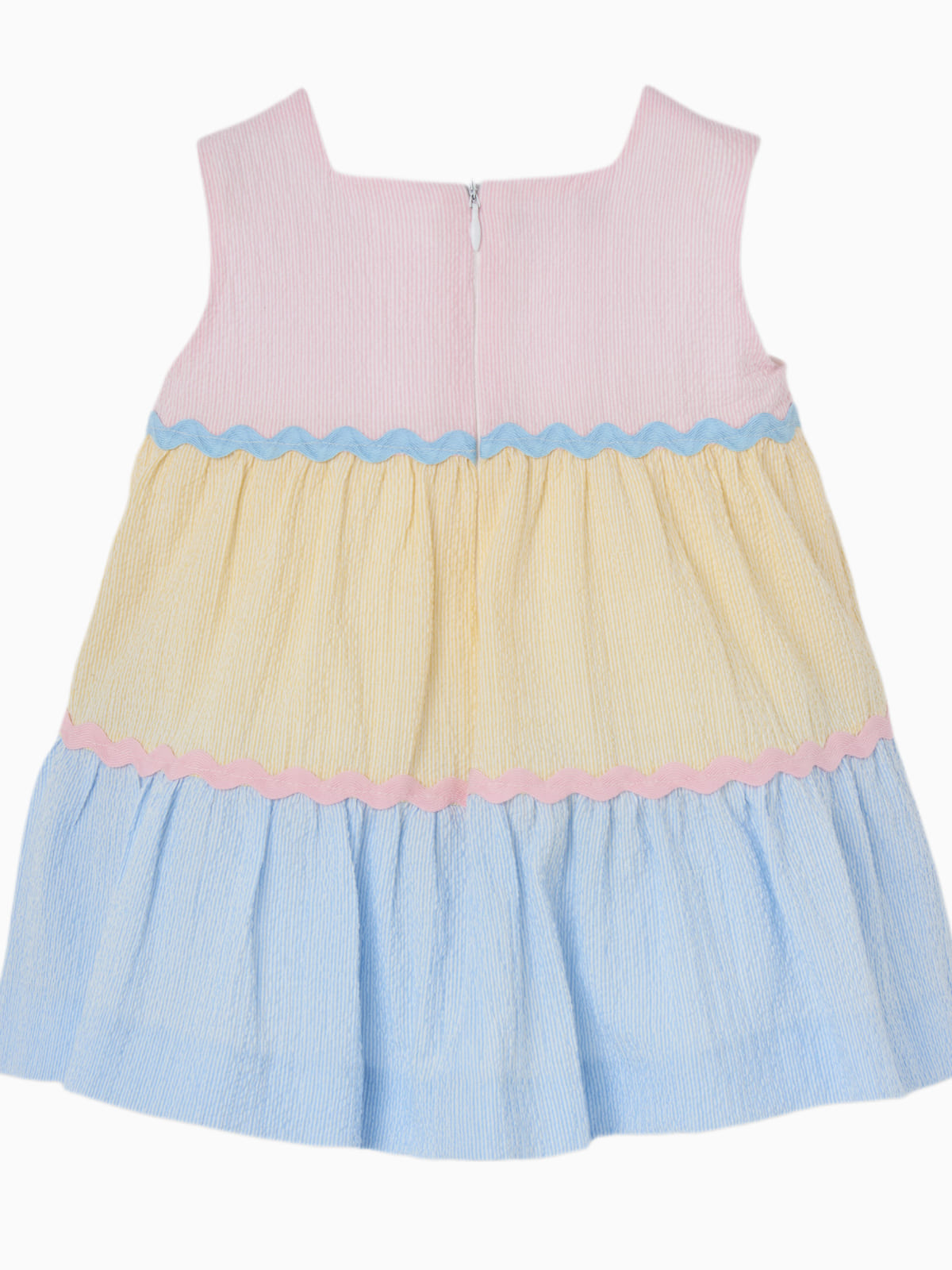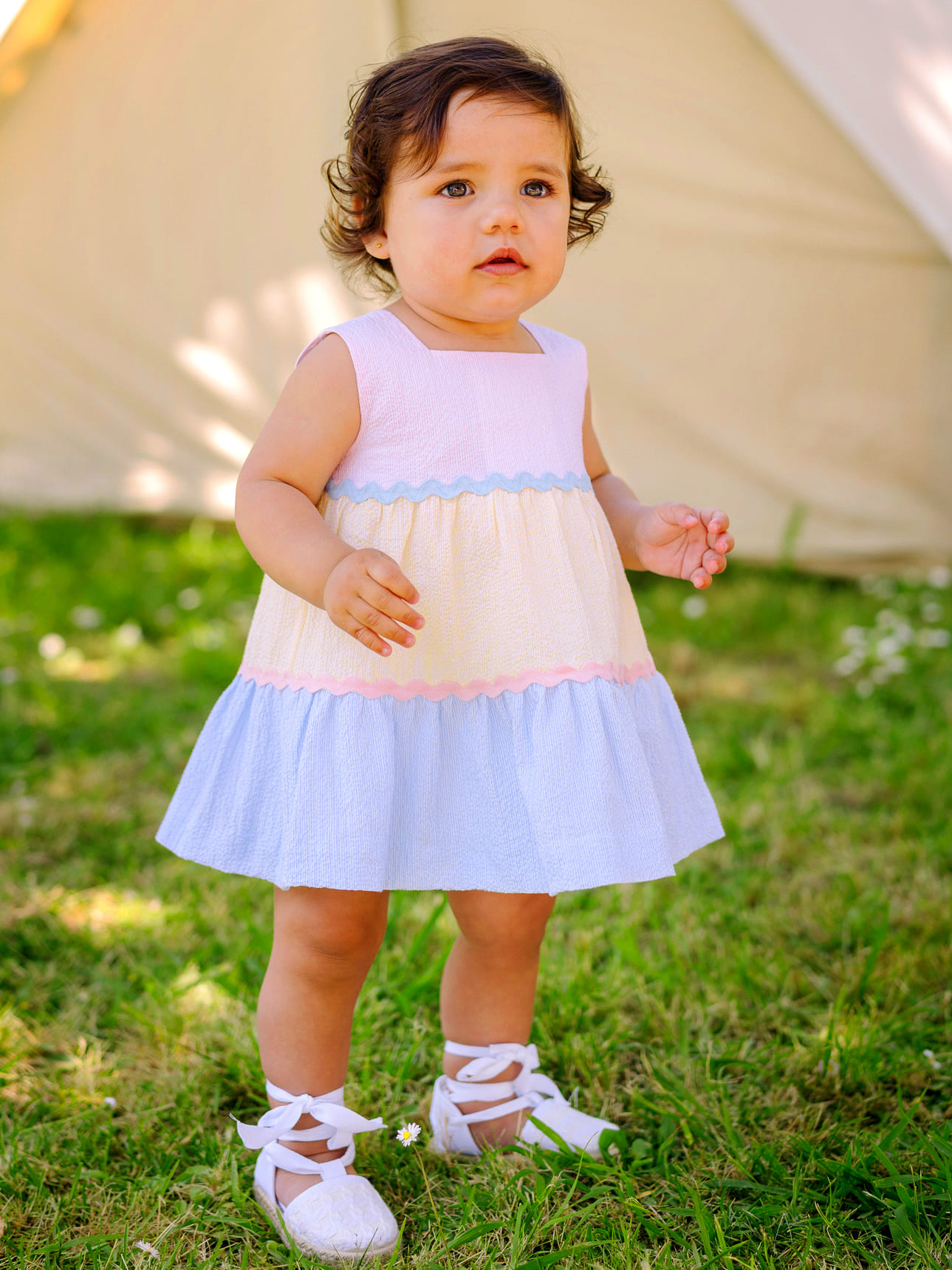 Notre robe petite fille en seersucker – multicolore est une pièce lumineuse et joyeuse, parfaite pour accompagner les journées ensoleillées. Ses nuances de rose, jaune et bleu ciel créent une harmonie douce et délicate, idéale pour un vestiaire estival raffiné.